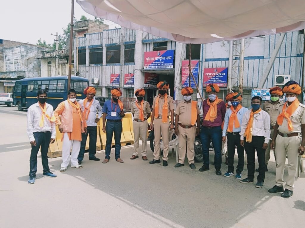 भीलवाड़ा (पंकज आडवाणी ) कोरोना महामारी में शहर की जनता की सुरक्षा में दिन-रात जान हथेली पर रखकर ड्यूटी पर तैनात पुलिसकर्मियों का अंतरराष्ट्रीय हिन्दू परिषद, राष्ट्रीय बजरंगदल के पदाधिकारियो द्वारा मेवाड़ी साफा,भगवा दुपट्टा ओढ़ाकर सम्मान व धन्यवाद ज्ञापित किया गया।