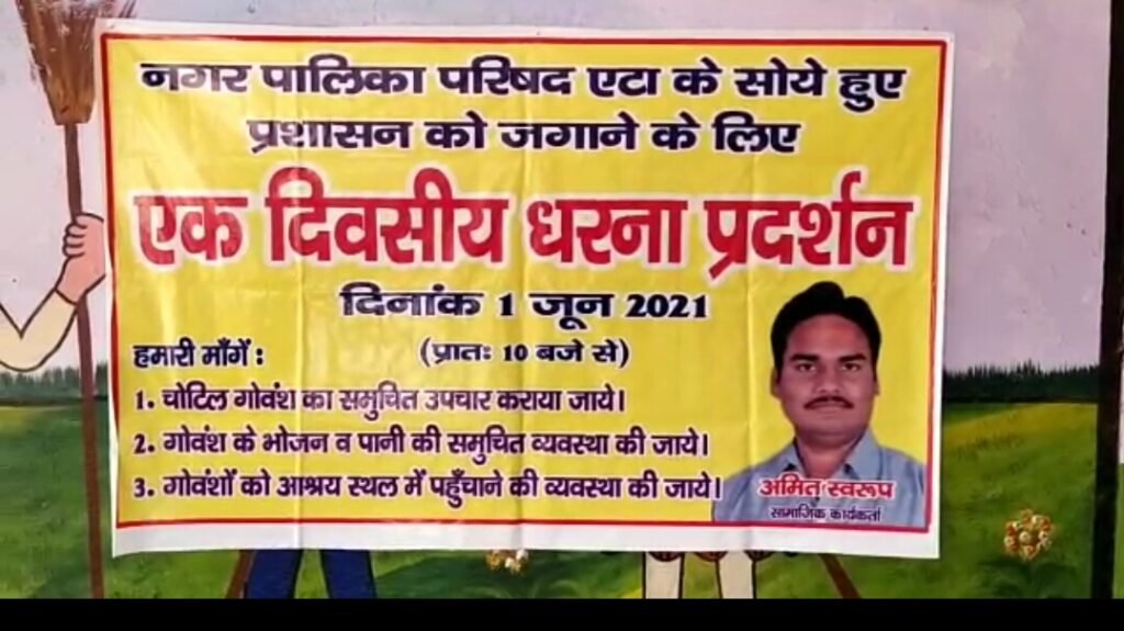 इन्हीं अव्यवस्थाओं को और गोवंश की दुर्गति को देखते हुए गौ रक्षा के लिए अमित स्वरूप सक्सेना ने एटा नगर पालिका में एक दिवसीय धरना प्रदर्शन किया। इसके बाद उनका समर्थन करने के लिए नगर के प्रमुख युवा समाजसेवी मेधा व्रत शास्त्री भी पहुंचे। इस अवसर पर मेधा व्रत शास्त्री ने कहा कि नाक, कान, आंख, मुंह होना ही मनुष्यता नहीं है। जब तक आप किसी एक बेजुबान जानवर के दर्द को भी नहीं समझ पाते तब तक आप को इंसान कहलाने का कोई हक नहीं है।