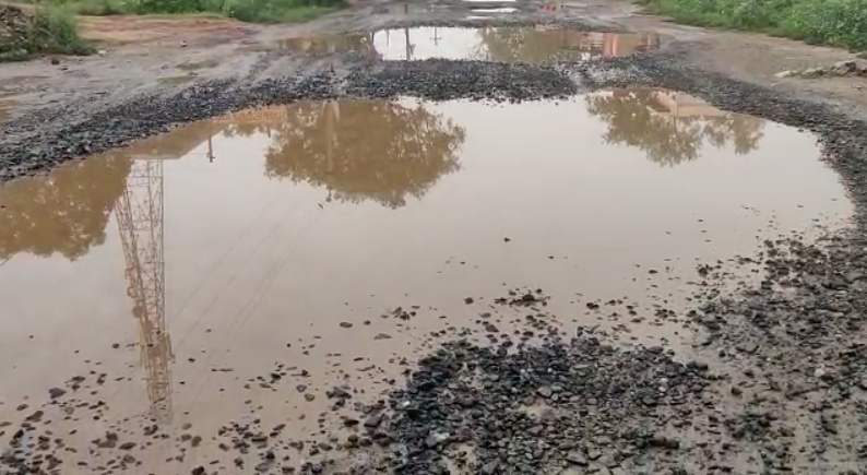 बहरोड़-कुण्ड स्टेट हाईवे पर बरसात के गड्डों में भरा पानी। चलना हुआ दुभर