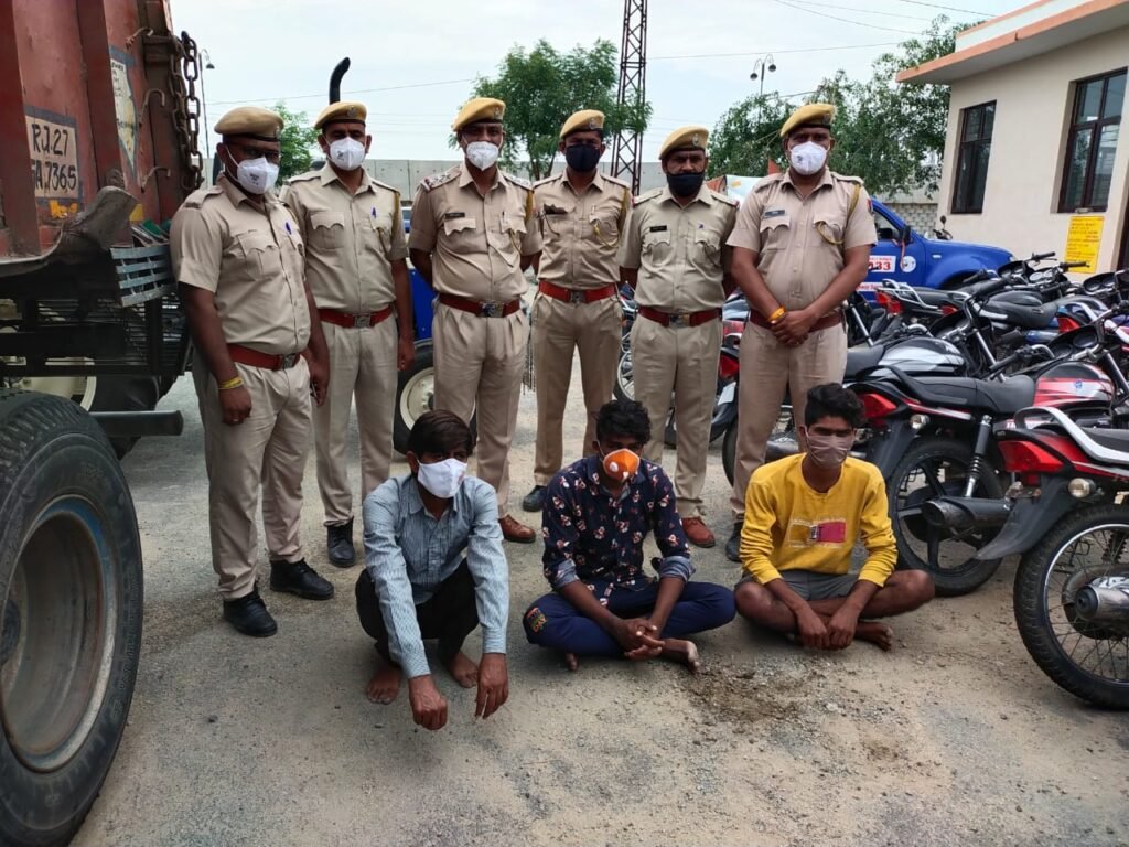भीलवाड़ा ( पंकज आडवाणी) जिले के पुर थाना पुलिस ने बढ़ती वाहन चोरियों और थाना क्षेत्र से ट्रैक्टर ट्रॉली चोरी हो जाने की घटना के बाद चोरों की तलाश में की गई छानबीन और साइबर तकनीकी की सहायता से वाहन चोर गैंग का खुलासा करते हुए तीन जनों को गिरफ्तार किया है। गिरफ्तार किए गए आरोपियों की निशानदेही पर 26 दुपहिया वाहन और एक ट्रैक्टर ट्रॉली बरामद की गई है।