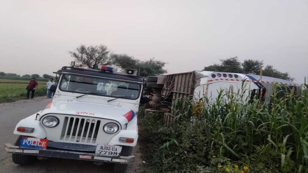 Khabrana Home » khabrana » सवारियों से भरी निजी ट्रांसपोर्ट की बस अनियंत्रित होकर पलटी। एक‌ की हालत गंभीर। चालक फरार