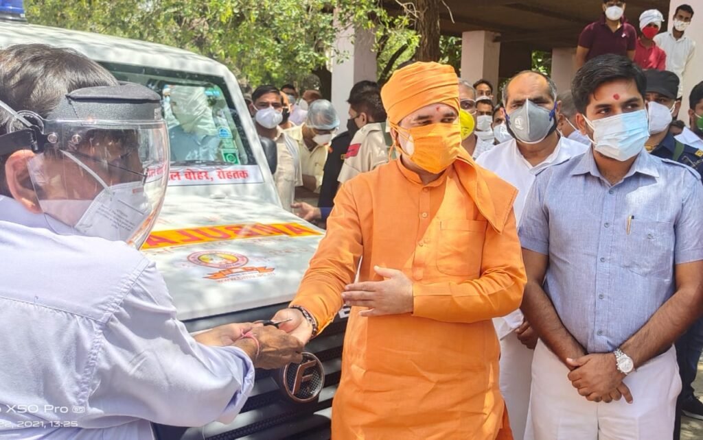 बहरोड ग्रामीण ( संदीप भारद्वाज) अलवर सांसद महंत बालक नाथ योगी बहरोड पहुंचे इस दौरान सांसद योगी ने अपने कोष से बहरोड़ स्वास्थ्य केंद्र को एक एंबुलेंस भेंट की है। इस दौरान भाजपा नेता मोहित यादव भी मौजूद रहे। सांसद योगी ने बताया कि कोरोना कि इस महामारी में लोगों की जितनी मदद हो सके उतनी करनी चाहिए ताकि हम सब की मदद से लोगों की जिंदगी को बचाया जा सके साथ ही बताया कि अस्पताल में अन्य किसी सामग्री की आवश्यकता पड़ेगी तो सहयोग के लिए योगी तत्पर रहेंगे वही स्थानीय लोगों ने भी महंत योगी का आभार जताया।