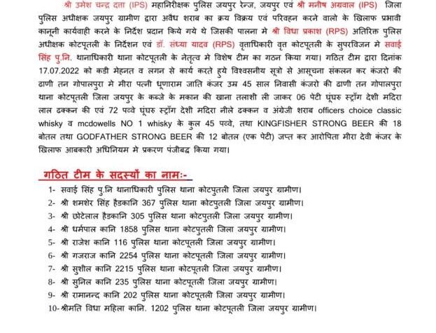 ख़बराना। बिल्लूराम सैनीकोटपूतली पुलिस थाना की अवैध शराब के खिलाफ बड़ी कार्यवाही की उमेश चन्द्र…