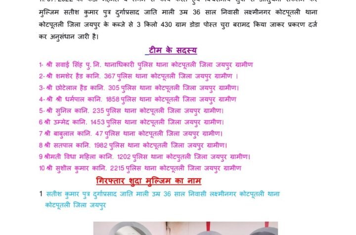 खबराना बिल्लूरामसैनी कोटपूतली स्थानीय थाना पुलिस अवैध मादक पदार्थ सहित एक अभियुक्त गिरफ्तार किया उमेश…