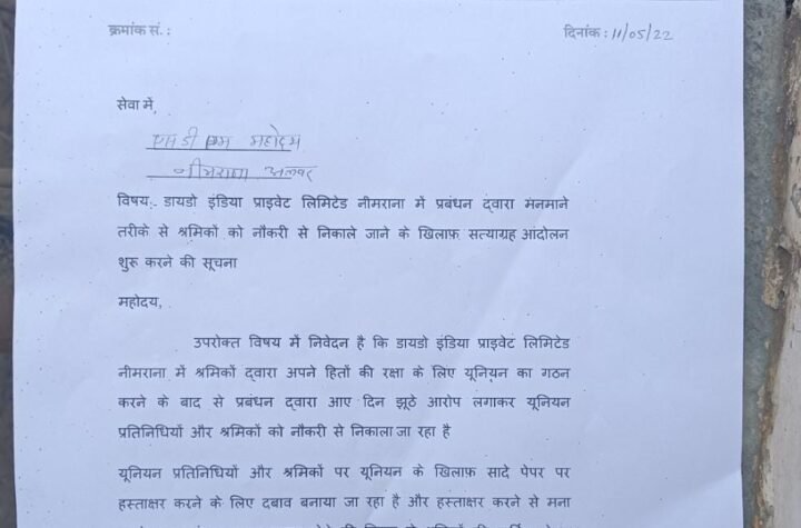 ख़बराना। नीमरानाबुधवार को जिसमें डायडो इंडिया प्राइवेट लिमिटेड नीमराना कंपनी में मजदूरों पर हो रहे…