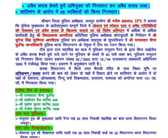 कोटपूतली / विराटनगर (बिल्लूराम सैनी) जिला पुलिस अधीक्षक जयपुर ग्रामीण मनीष अग्रवाल आईपीएस ने बताया…