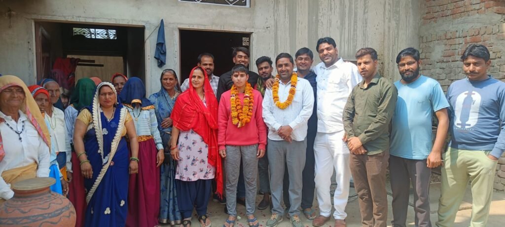 • बेटी बचाओ- बेटी पढ़ाओ अभियान के तहत बेटी के परिजनों का मिठाई खिलाकर वह माला पहना कर किया सम्मान।*इस मौके पर मौजूद रहे, एडवोकेट विक्रम सिंह कसाना (वीरू) पंचायत समिति सदस्य प्रतिनिधि, सरपंच प्रतिनिधि यादराम जी, राजेंद्र (मोती) अंजू के पापा महेंद्र जी बलवीर आर्य,कमल पंडित, राजेश कसाना, मनीष आर्य, मुनेश यादव जगदीश पुरा, सुमित्रा देवी, शारदा देवी, कौशल्या देवी काफी संख्या में मातृशक्ति मौजूद रही, सामाजिक कार्यकर्ता रवि शर्मा बनेठी ने माला पहना कर मिठाई खिलाकर के प्रतीक चिन्ह भेंट कर स्वागत किया व पंचायत समिति सदस्य व राजेंद्र ने अंजू को ट्रक – सूट वेट किया , सरपंच प्रतिनिधि यादराम ने नगद इनाम भेंट की ।। आए हुए अतिथि गणों ने बेटी का सम्मान करते हुए उनके उज्जवल भविष्य की कामना की। महिलाओं ने तिलक लगाकर स्वागत किया