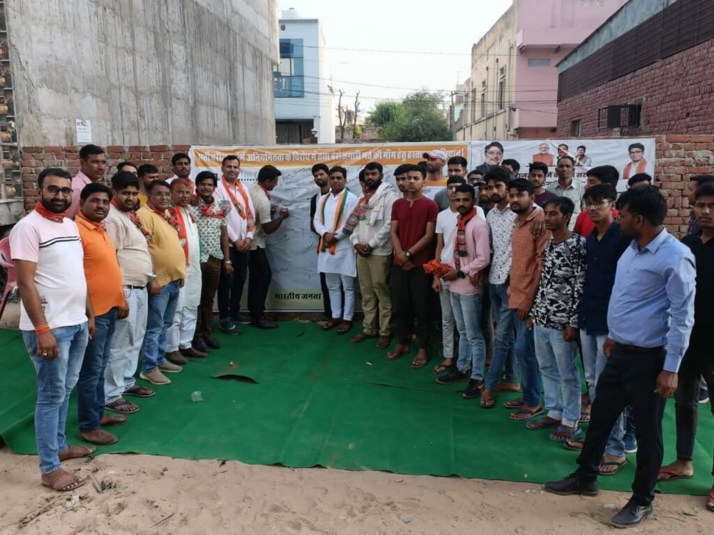 कोटपूतली (बिल्लुराम सैनी) आज दिनांक 18 अप्रैल से राजस्थान की कांग्रेस सरकार द्वारा भर्ती परीक्षाओं में किए गए घोटाले के विरोध तथा बेरोजगारों के लिए भत्ते की मांग को लेकर प्रदेश व्यापी हस्ताक्षर अभियान जयपुर जिला उत्तर के कोटपुतली मंडल से शुरू किया गया। राजस्थान भारतीय जनता पार्टी के प्रदेशाध्यक्ष डॉ सतीश जी पूनिया, भाजयुमो के प्रदेशाध्यक्ष डॉ हिमांशु शर्मा, जयपुर उत्तर के जिलाअध्यक्ष जितेंद्र शर्मा एवं जयपुर उत्तर भाजयुमो के जिला अध्यक्ष भगवान सहाय शर्मा के निर्देशानुसार आज यह हस्ताक्षर अभियान शुरू किया गया। राजस्थान में बढ़ रही बेरोजगारी एवं भर्ती परीक्षाओं में हो रही अनियमितताओं को लेकर इस अभियान को प्रदेश स्तर पर शुरू किया गया है।