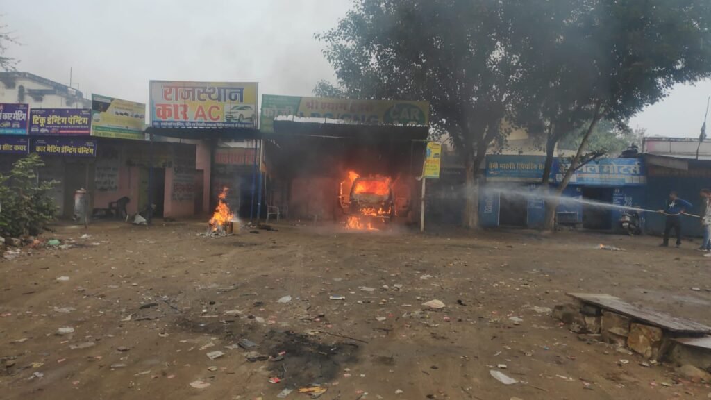 अलवर( दीक्षित कुमार ) कोतवाली थाना क्षेत्र अलकापुरी कार बाजार में करण मोटर्स पर सही होने आई एक इको कार के अंदर बैटरी में शार्ट सर्किट होने से कार में आग लग गई। कार में आग लगने से क्षेत्र में हड़कंप मच गया और स्थानीय दुकानदारों ने कार में आग लगने पर पानी डालकर आग बुझाने का प्रयास किया।