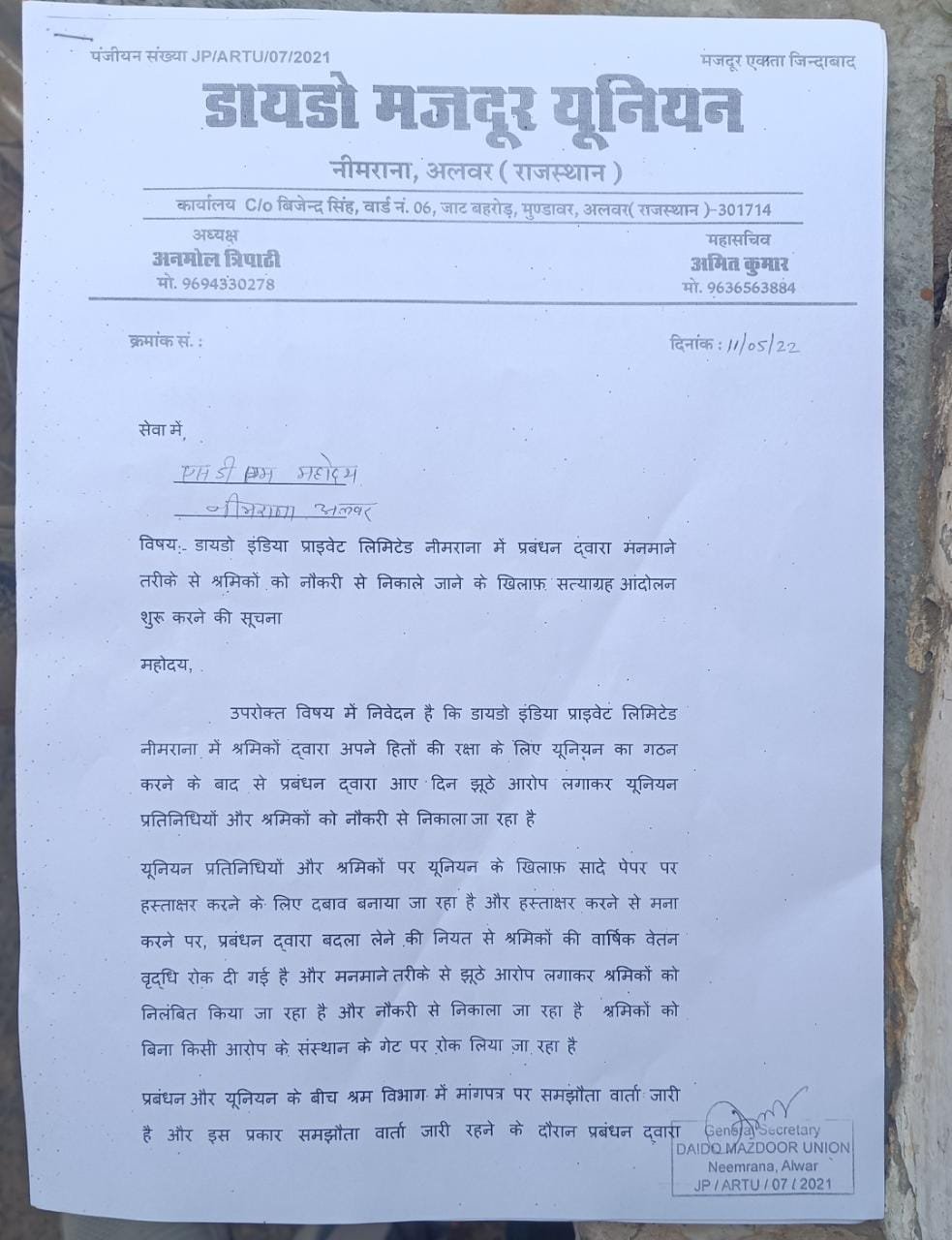 बुधवार को जिसमें डायडो इंडिया प्राइवेट लिमिटेड नीमराना कंपनी में मजदूरों पर हो रहे शोषण और मजदूरों को झूठे आरोप लगाकर कंपनी से निकाला जा रहा है जिसमें मजदूर परेशान हो रहा है और मजदूरों को आंदोलन करने के सिवा और कोई रास्ता नहीं दिख रहा है अब आंदोलन करने के लिए मजदूरों ने एसडीएम को अग्रिम सूचना दे दी है कि कंपनी प्रबंधन लगातार ऐसे ही कर रहा है