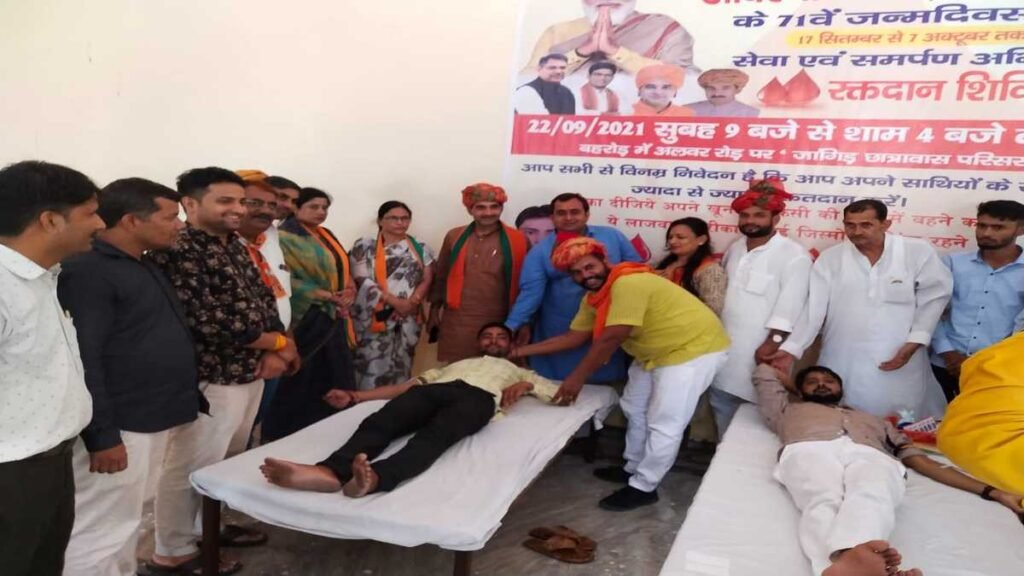 बहरोड (केडीसी) प्रधानमंत्री नरेंद्र मोदी के 71 वे जन्मदिवस एवं राजनीतिक जीवन के सफलतम 20 वर्ष पूर्ण होने पर पार्टी द्वारा चलाए गए सेवा समर्पण अभियान के अंतर्गत भाजपा युवा मोर्चा द्वारा युवा मोर्चा जिलाध्यक्ष अभय सिंह बिधूड़ी उर्फ भूरा गुर्जर के नेतृत्व में नालंदा डिफेंस एकेडमी जांगिड़ छात्रावास बहरोड में रक्तदान शिविर आयोजित हुआ । कार्यक्रम में मुख्य वक्ता भाजपा जिला अध्यक्ष बलवान सिंह यादव रहे । रक्तदान कार्यक्रम के संयोजक राहुल सैनी ने बताया कि रक्तदान शिविर में मोदी जी के 71 वें जन्मदिवस को लेकर 71 रक्त यूनिट लक्ष्य पूर्ण किया । कार्यक्रम का शुभारंभ भगवान विश्वकर्मा जी की पूजा अर्चना दीप प्रज्वलन करके किया गया एवं साथ ही स्वच्छता अभियान के कार्यक्रम के संयोजक पंडित वीरू भारद्वाज द्वारा सफाई अभियान चलाया गया । जिसमें जांगिड़ छात्रावास के परिसर की सफाई की गई । इस कार्यक्रम में पूर्व विधायक मामन सिंह यादव, जिला महामंत्री उमेद सिंह भाया, जिला उपाध्यक्ष उमेश शर्मा, शिवचरण यादव, जिला मंत्री डॉ नीलम यादव, महिला मोर्चा जिलाध्यक्ष चित्रा शर्मा, मंत्री सुनीता यादव , जिला कार्यसमिति सदस्य कर्मपाल सिंह चौहान, सुरेंद्र यादव मंडल अध्यक्ष, संजय मीर, सुनील यादव, मंडल महामंत्री अरुण शर्मा, जीतेंद्र, मंडल प्रवासी ओम यादव, कमल सिंह, मनोज यादव, रतनलाल, नालंदा डिफेंस एकेडमी के डायरेक्टर भगत सिंह यादव, जांगिड़ समाज के अध्यक्ष रामपाल जांगिड़, कोषाध्यक्ष रोशन लाल जांगिड़, दिनेश यादव, रितेश यादव, सुरेश यादव, प्रशांत शर्मा, राहुल जखराना, राजकुमार, विशाल , हेमंत एवं भाजपा कार्यकर्ता उपस्थित रहे ।