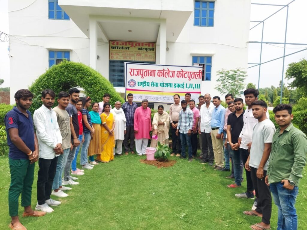 कोटपूतली कस्बे के डाबला रोड़ स्थित राजपूताना पी.जी. महाविधालय में शनिवार को बीडीओ शशीबाला वर्मा के मुख्य आतिथ्य व संस्था निदेशक महेन्द्र चौधरी की अध्यक्षता में पौधारोपण कार्यक्रम का आयोजन किया गया। इस मौके पर वक्ताओं ने पौधों को मानव जीवन का आधार बताते हुये कहा कि पर्यावरण संरक्षण हेतु पौधारोपण किया जाना आवश्यक है। विशिष्ट अतिथि रामचन्द्र सैनी, रामवतार सैनी, संस्था प्राचार्य डॉ. एच.एन. धोलीवाल ने भी अपने विचार व्यक्त किये। इस दौरान उपप्राचार्य उमरावलाल गुर्जर, सहायक प्रोफेसर आर.पी. धोलीवाल, निर्भय सिंह योगी, विजय कुमार धानका, अशोक सैनी, नीरु सैनी, सुरेन्द कुमार यादव, बीना चौपड़ा, पुस्तकालयाध्यक्ष चंचल, लेखाकार के.एन. वर्मा, फुलचन्द, जगदीश समेत सैकडों विद्यार्थी मौजूद थे।