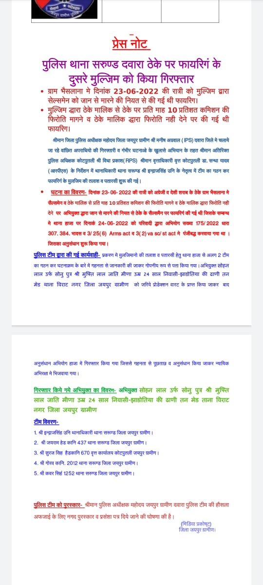मुल्जिम द्धारा ठेके मालिक से ठेके पर प्रति माह 10 प्रतिशत कमिशन की फिरोति मागने व ठेके मालिक द्वारा फिरोति नहीं देने पर की गई फायरिंग । जिला पुलिस अधीक्षक जिला जयपुर ग्रामीण मनीष अग्रवाल ( IPS ) द्वारा जिले मे चलाये जा रहे वांछित अपराधियों की गिरफ्तारी व गंभीर घटनाओ के खुलासे अभियान के तहत अतिरिक्त पुलिस अधिक्षक कोटपुतली विधा प्रकाश ( RPS ) वृत्ताधिकारी वृत्त कोटपुतली डा.सन्धा यादव ( आरपीएस ) के निर्देशन में थानाधिकारी थाना सरूण्ड इन्द्राजसिंह उनि के नेतृत्व में टीम का गठन कर फायरिंग के मुलजिम की तलाश व पतारसी शुरू की गई । घटना का विवरण दिनांक 23-06-2022 की रात्री को अंग्रेजी व देशी शराब के ठेके ग्राम भैसलाना मे सैल्समेन व ठेके मालिक से प्रति माह 10 प्रतिशत कमिशन की फिरोति मागने व ठेके मालिक द्वारा फिरोति नही देने पर अभियुक्त द्वारा जान से मारने की नियत से ठेके के सैल्समैन पर फायरिंग की गई थी। पुलिस टीम द्वारा की गई कार्यवाही प्रकरण में मुलजिमानों की तलाश व पतारसी हेतु थाना हाजा से अलग 2 टीम का गठन कर घटनाक्रम के बारे में गहनता से जानकारी की जाकर गोपनीय रूप से पता किया गया । अभियुक्त सोहन लाल उर्फ सोनु पुत्र मुफ्ति लाल जाति मीणा उम्र 24 साल निवासी झाडोतिया की ढाणी तन मेड थाना विराट नगर जिला जयपुर ग्रामीण को जरिये प्रोडेक्शन वारट के प्राप्त किया जाकर बाद अनुसंधान अभियोग हाजा में गिरफ्तार किया गया जिससे गहनता से पूछताछ व अनुसंधान किया जाकर न्यायिक अभिरक्षा में भिजवाया गया ।