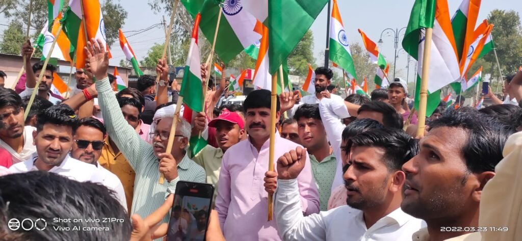 कोटपूतली (बिल्लूराम सैनी) बुधवार को शहीद भगतसिंह, सुखदेव और राजगुरु के बलिदान दिवस के अवसर पर राष्ट्र एकता रैली का आयोजन किया गया ।इस दौरान रामस्वरूप कसाना ने रैली को हरी झंडी दिखा कर छइर कॉलेज से रवाना किया जिसके बाद तिरंगा यात्रा कोटपूतली मार्केट से होते हुए शरणम पैरेडाईज पहुंचे यहाँ श्रदांजलि सभा का आयोजन किया गया ।इस तिरंगा यात्रा पर जगह जगह पुष्प वर्षा की गई इस दौरान क्षेत्र देशभक्ति के नारों और गीत से देशभक्तिमय हो गया ।कोटपूतली के हजारों युवाओ ने कार्यक्रम में भाग लेकर देश भक्ति का जज्बा और देश सेवा के लिए जागरूकता दिखाई ।