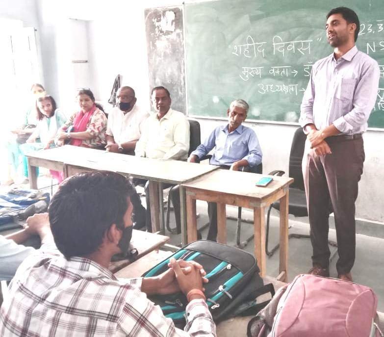 कोटपूतली (बिल्लूराम सैनी) शहर के राजकीय एलबीएस पी.जी. महाविद्यालय में राष्ट्रीय सेवा योजना की चारों इकाईयों के संयुक्त तत्वाधान में बुधवार को शहीद दिवस पर सेमीनार का आयोजन किया गया। प्राचार्य डॉ. आर. पी. गुर्जर ने स्वतंत्रता सेनानियों की प्रतिमा पर पुष्प अर्पित कर उन्हें श्रद्वांजलि दी। डॉ. विकास यादव ने शहीदों की जीवनी पर प्रकाश डाला। प्रो. सज्जन सिंह यादव ने शहीद दिवस के महत्व के बारे में बताया। प्राचार्य डॉ.आर.पी.गुर्जर द्वारा छात्रों को भगत सिंह, सुखदेव, राजगुरू के बलिदान पर व्याख्यान दिया गया। इस दौरान महाविद्यालय के छात्रों ने दो मिनट का मौन रखा। एनएसएस की चारों ईकाईयों के स्वयंसेवकों ने रैली का आयोजन किया। इस दौरान वरिष्ठ संकाय सदस्य डॉ. मधु नागर, डॉ. अमित शर्मा, डॉ. राजपाल सिरोहीवाल, प्रो. सुरेश कुमार यादव, डॉ. सुरेन्द्र यादव, रामपाल मीणा, नीरू, सुबिता, प्रो. रविन्द्र यादव, प्रो. अनिल कुमार शर्मा, अनिता यादव समेत अन्य मौजूद रहे।